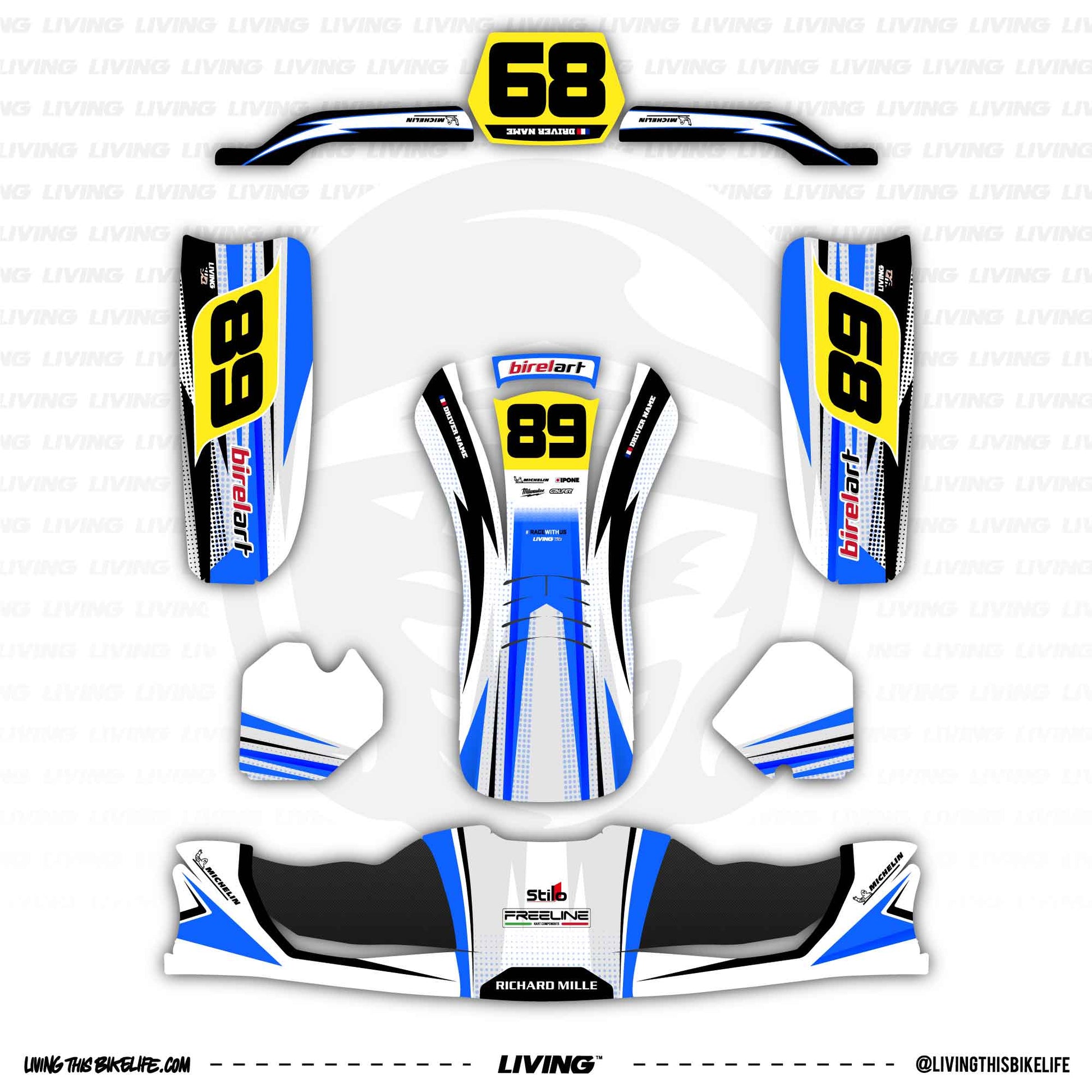 Our standard kit goes the top parts on Gloss and the lower parts, which suffer more from scratches and bumps, on Waffle. The standard print base is the white one. And if you don't select the custom option on the form, the graphic kit will go without driver name and number.